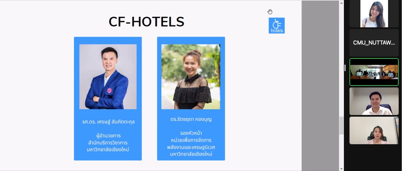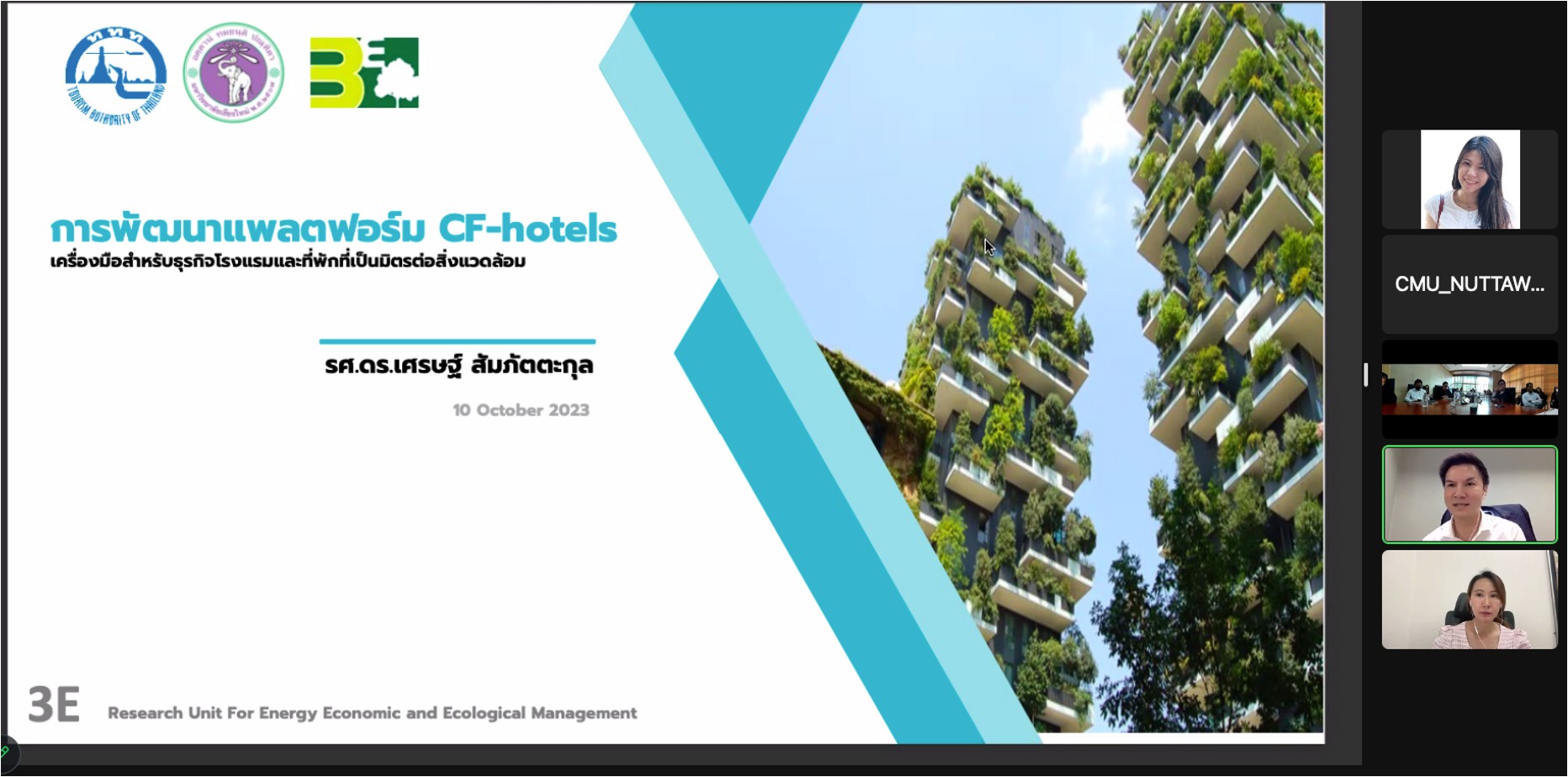 หน่วยวิจัย (3E) ร่วมกับ ททท. จัดกิจกรรมการอบรมเชิงปฏิบัติการการสร้างฐานข้อมูลบัญชีรายการสิ่งแวดล้อมบนแพลตฟอร์มออนไลน์ CF-Hotels (CF-Hotels x Ratchaprasong District x CMU)