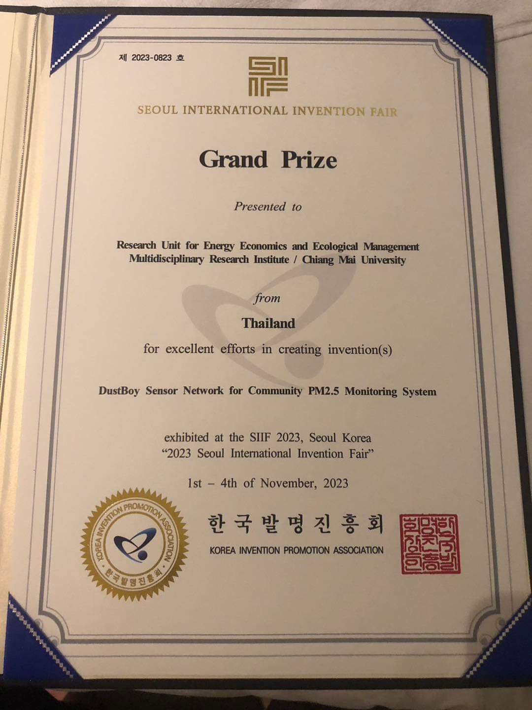 ☘️ เมื่อวันที่ 3 พฤศจิกายน 2566 นำโดย รศ.ดร. เศรษฐ์ สัมภัตตะกุล รักษาการแทนผู้อำนวยการสำนักบริการวิชาการ (UNISERV) มหาวิทยาลัยเชียงใหม่ และหัวหน้าทีมวิจัยศูนย์ข้อมูลการเปลี่ยนแปลงสภาพภูมิอากาศ (Climate Change Data Center: CCDC) พร้อมด้วยตัวแทนทีมนักวิจัย 3E ได้แก่ ดร.ภูชีวันท์ สุริยะวงค์ และดร.ฮัยสัม สาแม นำเสนอผลงานสิ่งประดิษฐ์ และนวัตกรรม “DustBoy Sensor Network for Community PM2.5 Monitoring System” คว้ารางวัลชนะเลิศระดับ “Grand Prize” รางวัลใหญ่สุดในการประกวดผลงานวิจัย สิ่งประดิษฐ์ และนวัตกรรม ในเวทีนานาชาติ "Seoul International Invention Fair 2023" (SIIF 2023) ณ กรุงโซล สาธารณรัฐเกาหลี