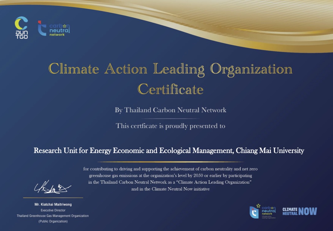☘️ Research Unit for Energy Economic & Ecological Management (3E) at the Multi-Disciplinary Research Institute, Chiang Mai University has been certified as a Climate Action Leading Organization (CALO) by the Thailand Carbon Neutral Network (TCNN). The certification was announced by the TCNN’s 4th Board of Directors Meeting on Tuesday, November 28, 2023.