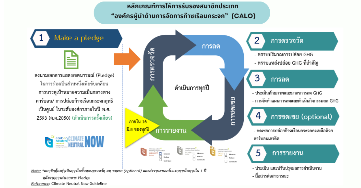 ☘️ สำหรับ “องค์กรผู้นำด้านการจัดการก๊าซเรือนกระจก” (Climate Action Leading Organization :CALO)" เป็นองค์กรที่แสดงความเป็นผู้นำในการจัดการและรับผิดชอบต่อการปล่อยก๊าซเรือนกระจกขององค์กรผ่านการแสดงเจตนารมณ์ที่จะลดการปล่อยก๊าซเรือนกระจกเพื่อมุ่งสู่คาร์บอนนิวทรัลในระดับองค์กรโดยมีปีเป้าหมายและแผนการดำเนินงานที่ชัดเจน สอดคล้องกับหลักการทางวิทยาศาสตร์และเป้าหมายของความตกลงปารีสและได้รับการรับรองคาร์บอนฟุตพรินท์ขององค์กรและมาตรฐานอื่นๆ ที่เกี่ยวข้องจากองค์การบริหารจัดการก๊าซเรือนกระจก (องค์การมหาชน) หรือ มาตรฐานสากลที่เทียบเท่า