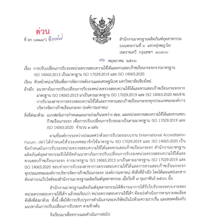 ☘️ ตามที่องค์การระหว่างประเทศว่าด้วยการรับรองระบบงาน (international Accreditation Forum :IAF) ได้กำหนดให้ประเทศสมาชิกใช้มาตรฐาน ISO 17029:2019 และ ISO 14065:2020 เป็นข้อกำหนดในการรับรองหน่วยตรวจสอบความใช้ได้และทวนสอบก๊าซเรือนกระจก สำนักงานมาตรฐานผลิตภัณฑ์อุตสาหกรรม จึงได้จัดทำแนวทางในการปรับเปลี่ยนการรับรองหน่วยตรวจสอบความใช้ได้และทวนสอบก๊าซเรือนกระจก จากมาตรฐาน ISO14065:2013 มาเป็นมาตรฐาน ISO17029:2019 และ ISO14065:2020 ขอบข่ายการรับรองสาขาการตรวจสอบความใช้ได้และการทวนสอบก๊าซเรือนกระจกทุกประเภทขององค์การบริหารจัดการก๊าซเรือนกระจก (องค์การมหาชน) โดยได้เผยแพร่เอกสารดังกล่าวบนเว็บไซต์ของสำนักงานมาตรฐานผลิตภัณฑ์อุตสาหกรรม เมื่อวันที่ 7 กุมภาพันธ์ 2566