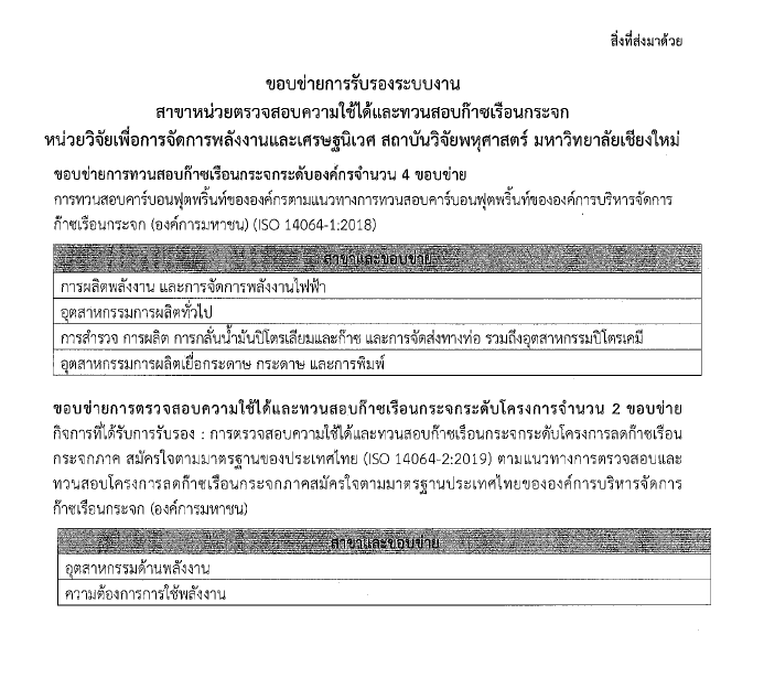 ตามมาตรฐาน ISO/IEC17029:2019 และ ISO14065:2020 ในการรับรองระบบงานหน่วยตรวจสอบความใช้ได้และทวนสอบก๊าซเรือนกระจกแก่หน่วยวิจัยเพื่อการจัดการพลังงานและเศรษฐนิเวศ