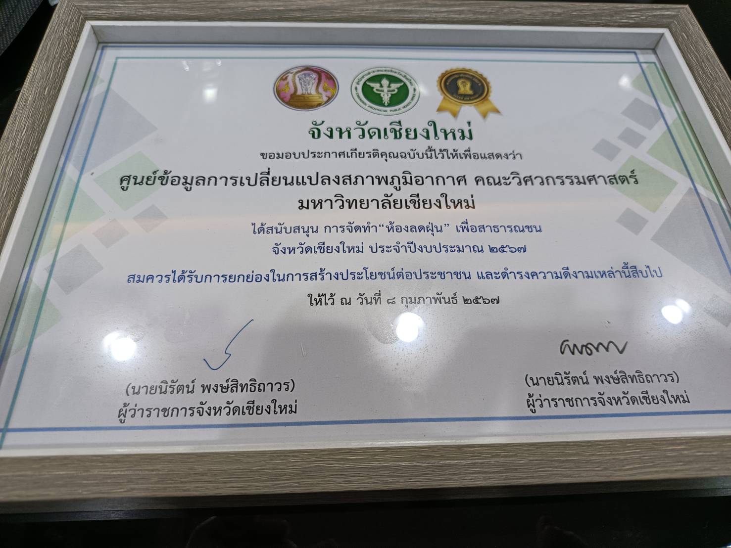 CMU CCDC รับใบประกาศเกียรติคุณจากจังหวัดเชียงใหม่ จากการสนับสนุนจัดทำแพลตฟอร์มห้องลดฝุ่นเชียงใหม่