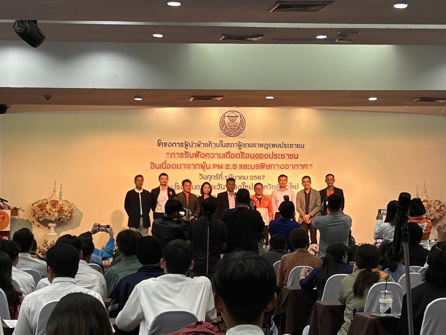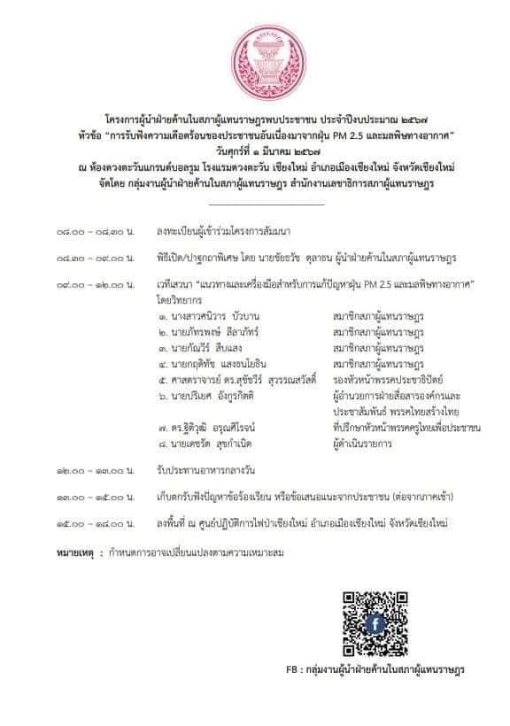 รองศาสตราจารย์ ดร.เศรษฐ์ สัมภัตตะกุล รักษาการผู้อำนวยการสำนักบริการวิชาการ และหัวหน้าศูนย์ข้อมูลการเปลี่ยนแปลงสภาพภูมิอากาศ มหาวิทยาลัยเชียงใหม่ ร่วมจัดนิทรรศการในกิจกรรมการรับฟังความเดือดร้อนของประชาชนอันเนื่องมาจากฝุ่น PM2.5 และมลพิษทางอากาศ ซึ่งเป็นหนึ่งในโครงการผู้นำฝ่ายค้านในสภาผู้แทนราษฎรพบประชาชน และจะได้นำความคิดเห็นจากนักวิชาการ นักศึกษาและประชาชนทั่วไป เกี่ยวกับปัญหาอันเนื่องมาจากฝุ่น PM 2.5 และมลพิษทางอากาศเพื่อนำไปสู่การผลักดันการแก้ไขทั้งในด้านนโยบาย ด้านกฎหมาย และการดำเนินการตามกระบวนการนิติบัญญัติ