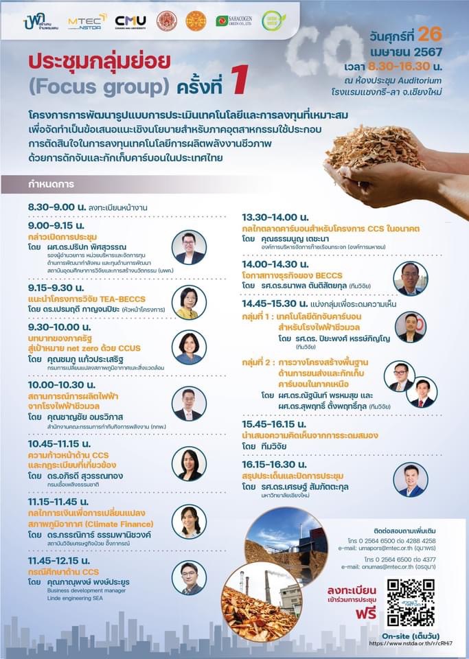 ☘️ เมื่อวันที่ 26 เมษายน 2567 หน่วยบริหารและจัดการทุนด้านการพัฒนากำลังคนและทุนด้านการพัฒนาสถาบันอุดมศึกษา การวิจัยและการสร้างนวัตกรรม (บพค.) จัดประชุมกลุ่มย่อย (Focus groups ) ครั้งทึ่ 1 ภายใต้ "โครงการการพัฒนารูปแบบการประเมินเทคโนโลยีและการลงทุนที่เหมาะสมเพื่อจัดทำเป็นข้อเสนอแนะเชิงนโยบายสำหรับภาคอุตสาหกรรมใช้ประกอบการตัดสินใจในการลงทุนเทคโนโลยีการผลิตพลังงานชีวภาพด้วยการดักจับและกักเก็บคาร์บอน (BECCS )ในประเทศไทย" ซึ่งเป็นโครงการที่ บพค. ให้การสนับสนุนภายใต้แผนงาน N42 (S3P19) ประเด็นวิจัย การพัฒนานวัตกรรมและเทคโนโลยีขั้นแนวหน้าเพื่อขับเคลื่อนเป้าหมายการปล่อยก๊าซเรือนกระจกสุทธิเป็นศูนย์ (Net Zero GHG) สำหรับอุตสาหกรรมแห่งอนาคตและบริการแห่งอนาคต โดยกล่าวเปิดงานโดย ผศ.ดร.ปริปก พิศสุวรรณ รองผู้อำนวยการ หน่วยบริหารและจัดการทุนด้ารการพัฒนากำลังคนและทุนด้านการพัฒนา สถาบันอุดมการศึกษาการวิจัยและการการสร้างนวัตกรรม (บพค.)