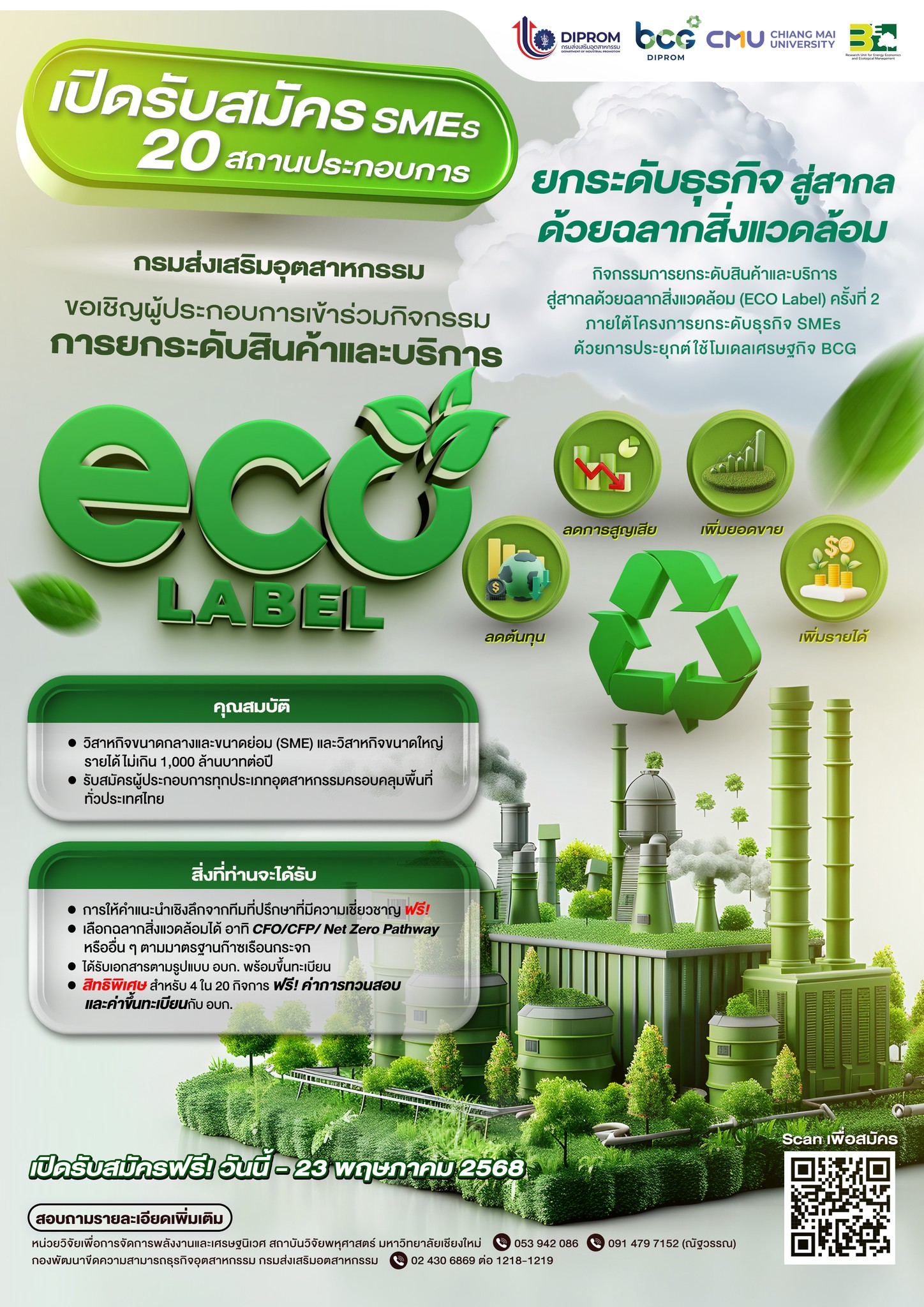 กรมส่งเสริมอุตสาหกรรม เปิดรับสมัคร 20 ธุรกิจ SMEs ไทย (ทุกประเภทอุตสาหกรรม) เข้าร่วมโครงการ "ยกระดับธุรกิจ SMEs ด้วยการประยุกต์ใช้โมเดลเศรษฐกิจ BCG: ECO Label" ฟรี!