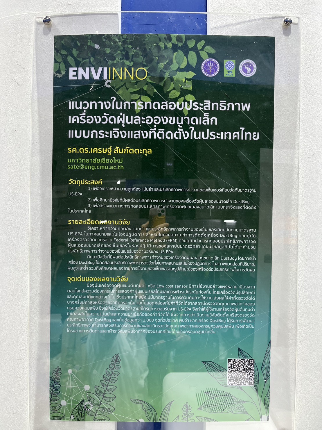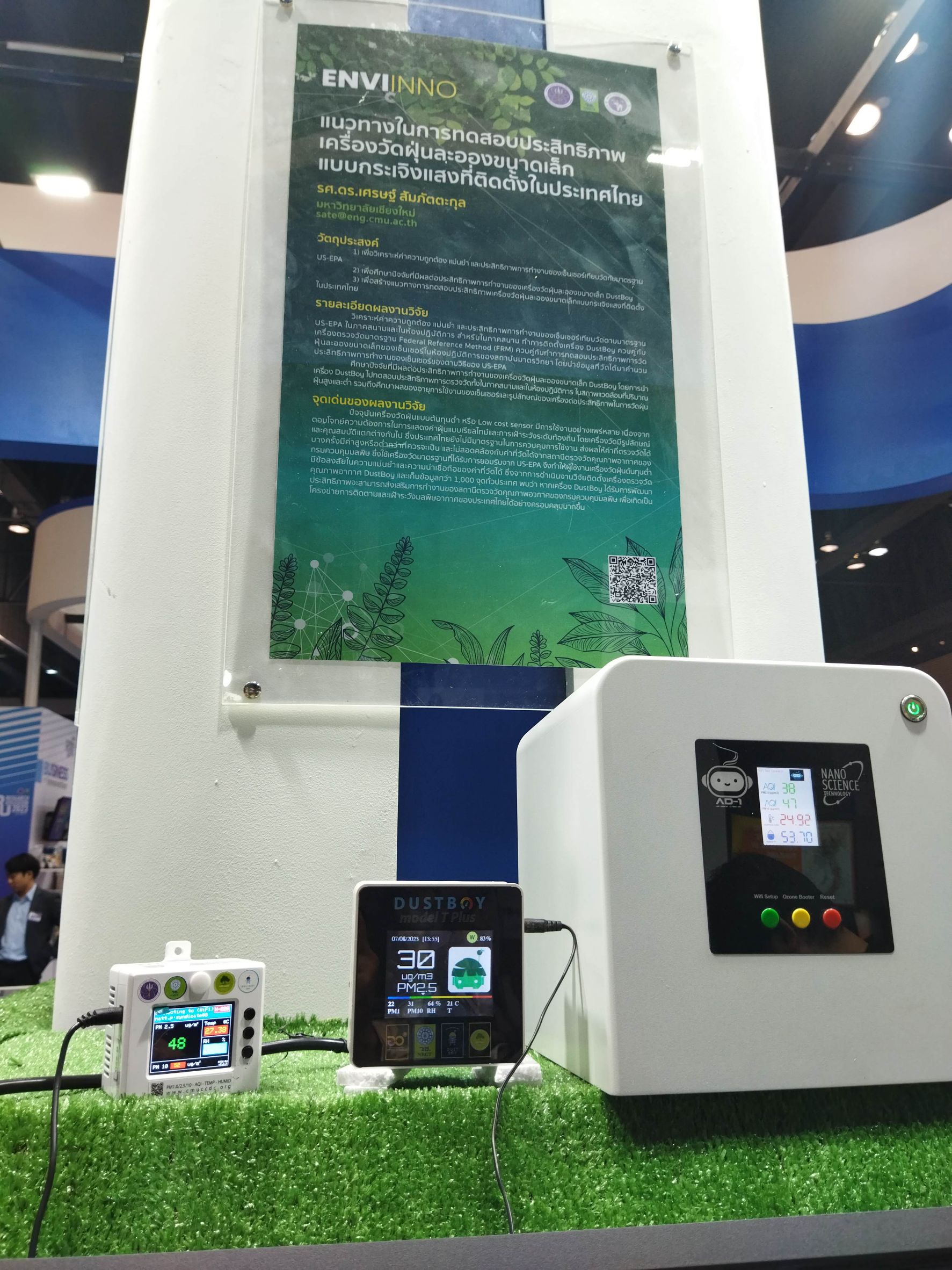 ทั้งนี้หน่วยวิจัยเพื่อการจัดการพลังงานและเศรษฐนิเวศ (3E) มหาวิทยาลัยเชียงใหม่ เป็นหน่วยงานเครือข่ายในระบบวิจัยของสำนักงานการวิจัยแห่งชาติ (วช.) กระทรวงการอุดมศึกษา วิทยาศาสตร์ วิจัยและนวัตกรรม ภายในบูธกิจกรรม พบกับ ENVIINNO “แนวทางในการทดสอบประสิทธิภาพเครื่องวัดฝุ่นละอองขนาดเล็กแบบกระเจิงแสงที่ติดตั้งในประเทศไทย” DustBoy AD-1 และแอพพลิเคชั่น AQIC ที่แสดงค่าฝุ่นในพื้นที่ที่ต้องการ/แผนที่จุดติดตั้งทั่วประเทศ (TH Index US Index) ระหว่างวันที่ 7-11 สิงหาคม 2566 ห้องเวิลด์บอลรูม ชั้น 23 โรงแรมเซ็นทาราแกรนด์ และบางกอกคอนเวนชันเซ็นเตอร์ เซ็นทรัลเวิลด์