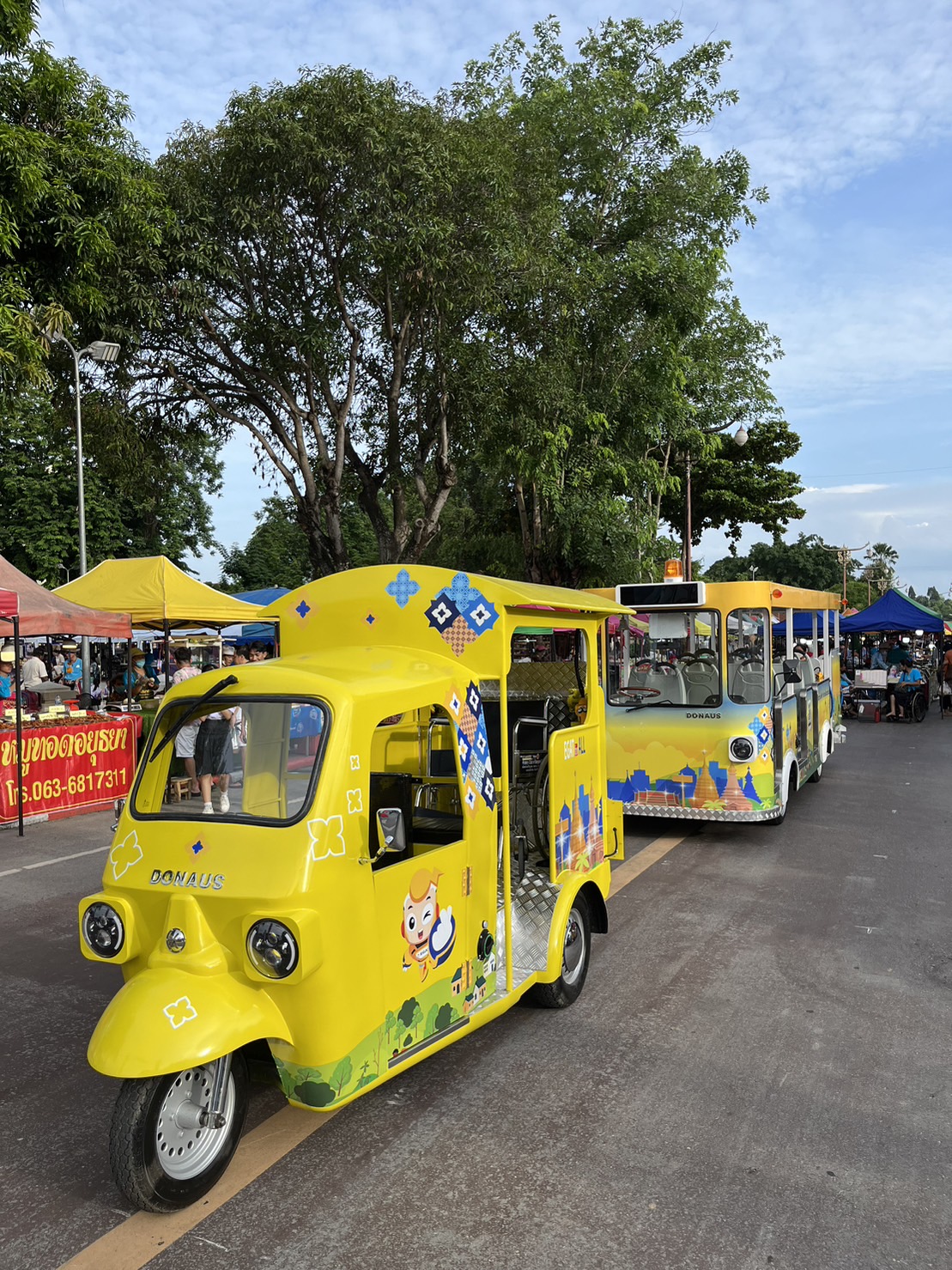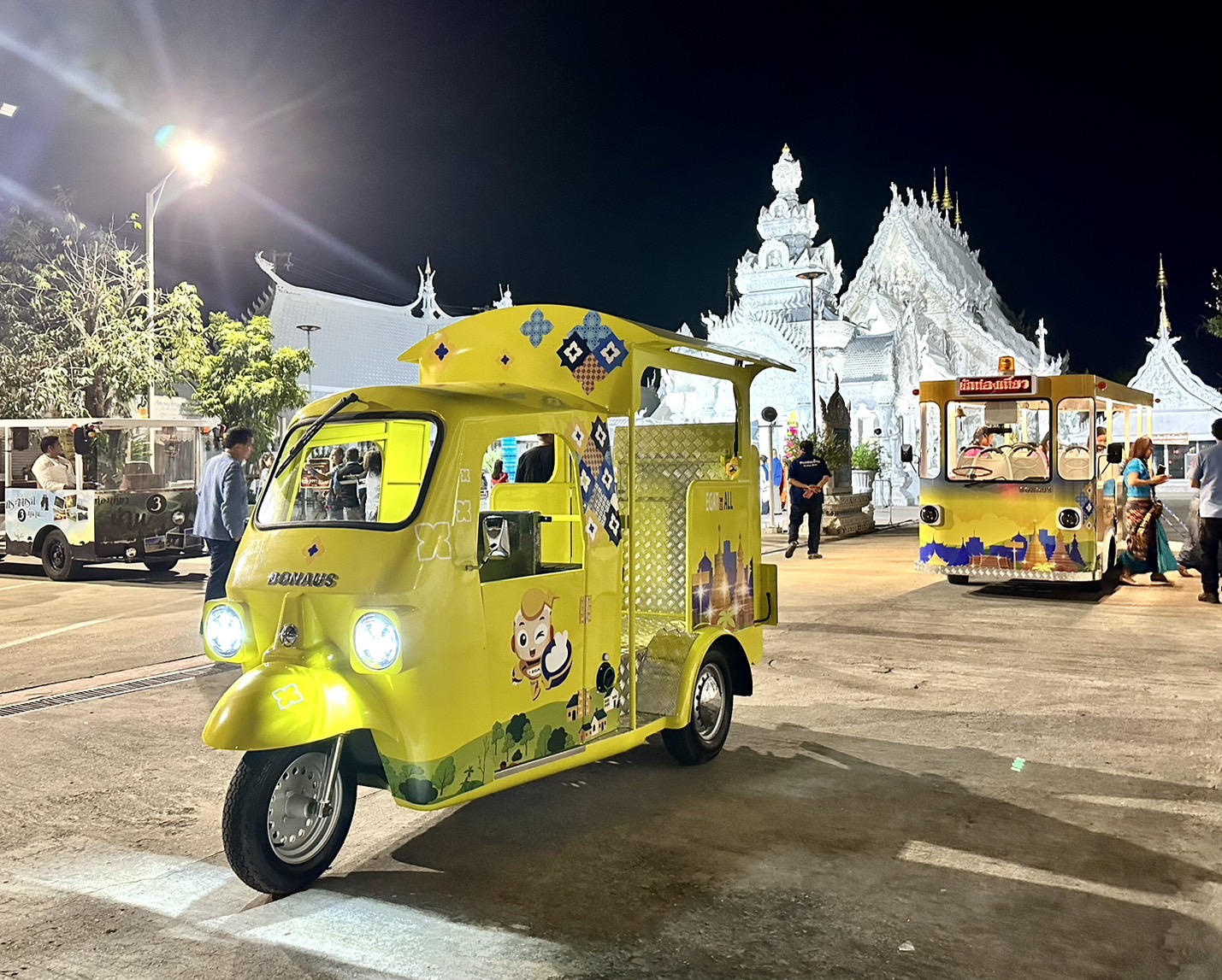 LED โดยรถรางไฟฟ้าและรถยนต์สามล้อไฟฟ้าเป็นผลงานการพัฒนาจากมหาวิทยาลัยเชียงใหม่ร่วมกับการไฟฟ้าฝ่ายผลิตแห่งประเทศไทย